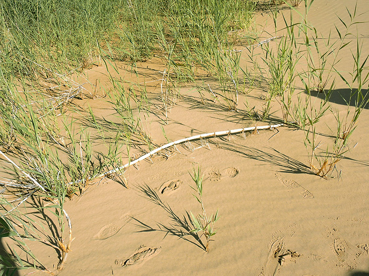 Třtina pobřežní (Calamagrostis pseudophragmites) má až 10 m dlouhé oddenky – zde je část oddenku odhalena na povrchu půdy – a snáší pravidelné zasypání pískem. Vnitřní Mongolsko, Bayannur, Čína. Foto J. Klimešová
