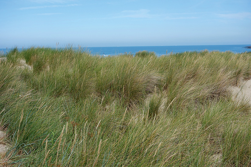 Mistrem ve schopnosti vydržet zasypávání pískem, akumulovat ho kolem sebe a stabilizovat tak jeho pohyb je kamýš obecný (Ammophila arenaria). Jde o statnou oddenkatou trávu, původní v pobřežních oblastech Evropy, ale zavlečenou do celého světa jako prostředek stabilizace dun. Její efekt je tak výrazný, že např. změní původní druhově bohatá společenstva specializovaných rostlin na monotónní travnaté porosty. Pobřežní duny v Nizozemsku. Foto T. Kučera