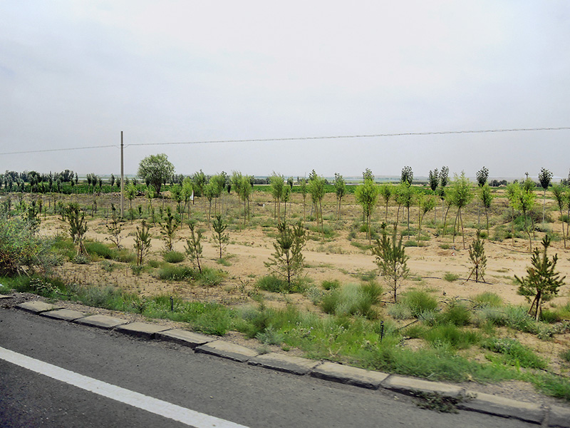 Výsadba borovice deskovité (Pinus tabuliformis) a topolu Simonova (Populus simonii) ve větrolamu podél silnice. Vnitřní Mongolsko, Gobi, Čína. Foto J. Klimešová