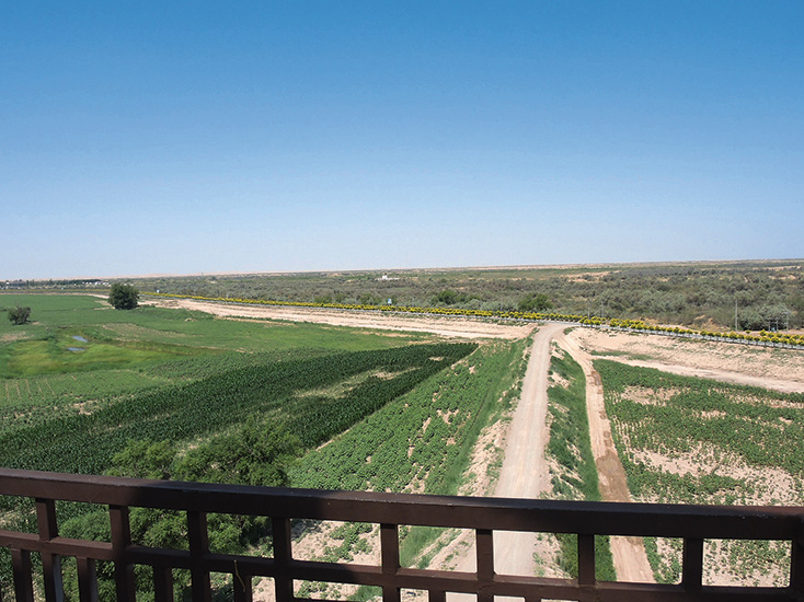 Protipovodňová hráz odděluje zemědělskou půdu kolem Žluté řeky od písečných dun. Vnitřní Mongolsko, Bayannur, Čína. Foto J. Klimešová