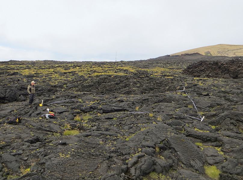 Vedoucí biologických expedic na Surtsey a zakladatel Surtseyské vědecké společnosti Borgþór Magnússon při mapování zdejší vegetace. Každoročně jezdí na Surtsey od r. 1990. Foto J. Grétarsdóttir