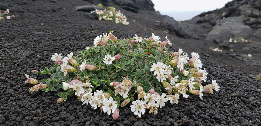 Silenka jednokvětá (Silene uniflora) je na Surtsey hojným druhem, zvláště na tmavé vulkanické tefře, jak označujeme sopečný materiál vyvržený při erupci. Foto J. Grétarsdóttir