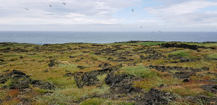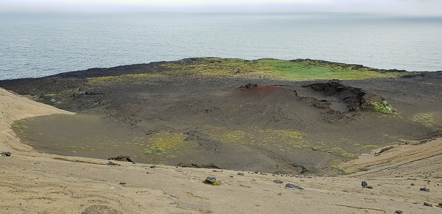Pohled na jižní část ostrova Surtsey, kde hnízdí kolonie racků žlutonohých (Larus fuscus). Tato kolonie má velký vliv na kolonizaci ostrova rostlinami, protože ptáci sem přinášejí v zažívacím traktu semena rostlin. Tím se dostávají semena i živiny do substrátu a neustále se tak zlepšují půdní podmínky. Dochází k přenosu živin nejen z pevniny, ale i z oceánu na ostrov. Foto J. Grétarsdóttir