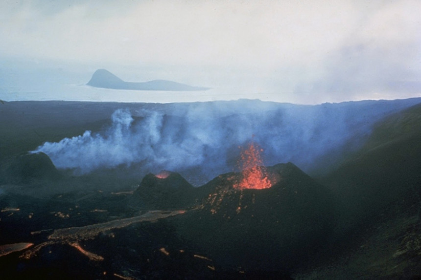Surtsey 27. srpna 1966. Proudy lávy ze tří malých sopečných kuželů. Erupce začala v listopadu 1963 a rychle se vytvořil nový ostrov, od dubna 1964 s výrony lávy. Erupce pokračovaly až do r. 1967. Malý ostrov Jolnir v pozadí vznikal 800 m jihozápadně od Surtsey od konce října 1965 a procházel opakovanými epizodami růstu a destrukce, v říjnu 1966 působením eroze zanikl. Foto R. Williams, U.S. Geological Survey