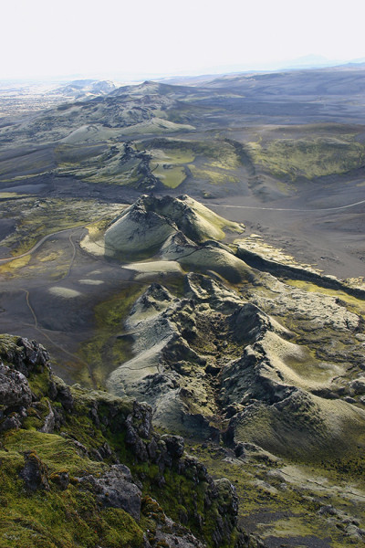 Řetězec drobných pyroklastických kuželů puklinové erupce Laki na Islandu. Foto V. Rapprich