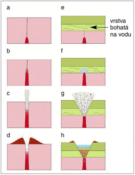 Princip sopečných erupcí: magmatické erupce, hnané jen sopečným plynem (a–d), a maarové erupce, řízené dodatečným plynem – vodní párou (e–h). Orig. V. Rapprich