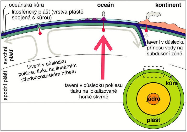Schematický nákres tvorby magmatu v různých geotektonických prostředích. Orig. V. Rapprich