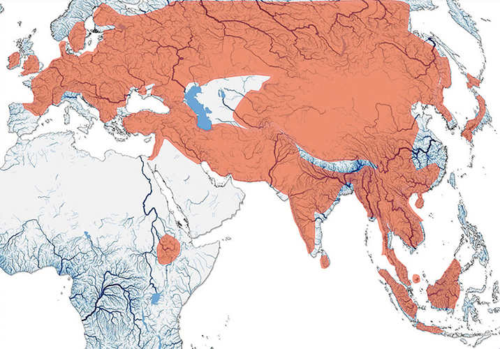 Současné rozšíření ryb čeledi Nemacheilidae (červeně). Upraveno podle: V. Šlechtová a kol. (2025)