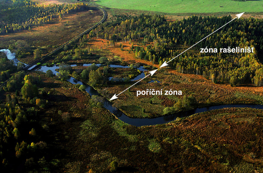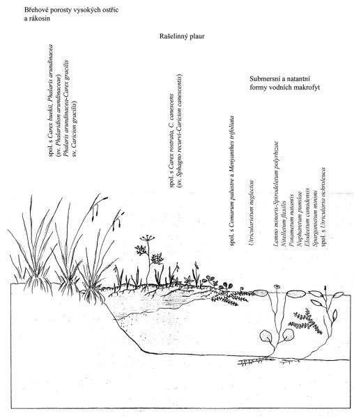 Tůň odstaveného říčního ramene v nivě Vltavy pod obcí Pěkná nedaleko Volar ve Vltavském luhu. Dobře patrná je sukcesní hydrosérie od vodních makrofytů s bublinatkou jižní (Utricularia australis) přes plovoucí ostřicovo-rašeliníkový koberec s ostřicí zobánkatou (Carex rostrata) k porostům mokřadních vrbin s vrbou popelavou (Salix cinerea) v pozadí. Poříční vegetace má v oblasti Vltavského luhu výrazně severský charakter. Foto I. Bufková