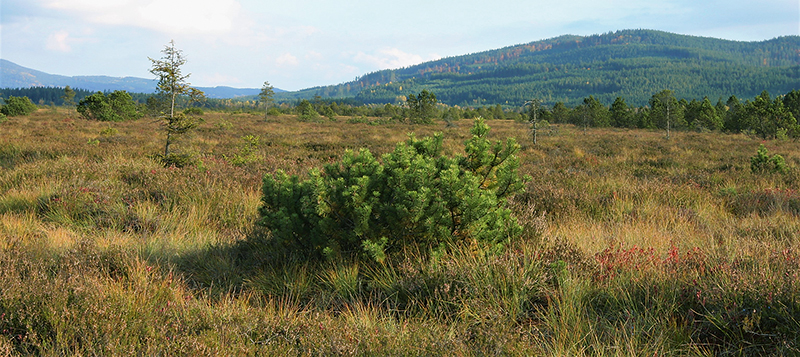 Vrchovištní vegetace s porosty borovice zobanité blatky (Pinus uncinata subsp. uliginosa) na rašeliništi Malá Niva. Foto I. Bufková