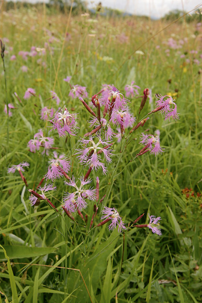 Hvozdík pyšný (Dianthus superbus) se vzácně vyskytuje v poříční zóně na mělkých půdách vytvořených nad hrubšími sedimenty, se silně kolísající hladinou podzemní vody. Foto I. Bufková