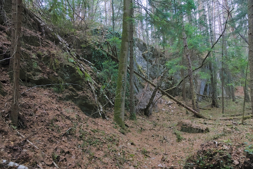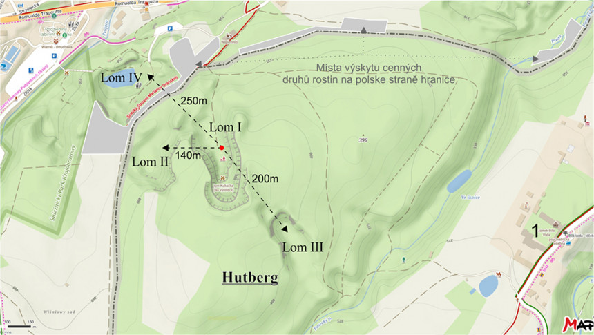 The Hutberg hill, which is located near Bílá Voda (Jeseník district), close to the border with Poland, is characterised by unique vegetation. As a result of the different types of use – active protection in the first quarry (I), the spontaneous development of vegetation in the second (II) and third (III) quarry, as well as the operation of tourist activities in the fourth (IV) – we have the opportunity to observe different effects in the world of plants. Thanks to this, 13 noteworthy species are found in quarries I, II and III in an area of approximately 7,0 ha – three critically endangered (CR), six threatened (EN) and four vulnerable (VU). In the first quarry, known as VKP Kukačka, mainly photophilous species grow: Gentianella amarella subsp. amarella (CR), Gentiana cruciata (EN), Dianthus superbus subsp. superbus (EN), Pyrola rotundifolia (EN), Gentianopsis ciliata (VU) and Platanthera bifolia (VU). The plants of the second and third quarries, which are located approximately 140 m and 200 m from VKP Kukačka, have not yet been described. There are also some very rare species in the Czech Republic that prefer shading. These are mainly ferns: Asplenium adiantum-nigrum (CR), A. trichomanes subsp. hastatum (EN), Epipactis albensis (EN), Polystichum lonchitis (EN; two individuals dried up in 2018), A. scolopendrium (VU) and Lilium bulbiferum var. bulbiferum (VU). For the first time, non-threatened species were also recorded: Asplenium viride, A. ruta-muraria, Cephalanthera damasonium and Lilium martagon.