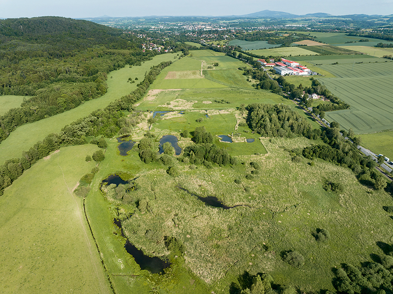 Revitalizované Sedmihorské mokřady v CHKO Český ráj z ptačí perspektivy. Na snímku blíže (uprostřed) část mokřadů víceméně ponechaná přirozeným renaturačním procesům, část vpravo je určena k připravované pastvě exmoorských poníků. Vzdálenější část po proběhlé revitalizaci území včetně tvorby vodních prvků, v pozadí bývalý zemědělský dvůr Valdštejnsko, dnes výrobna s halami, a prostor plánované rychlostní silnice I/35. Foto P. Stráníková