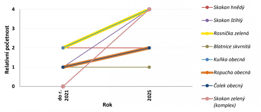 Odhadované změny relativní početnosti vyskytujících se obojživelníků před provedenou revitalizací území (tedy do r. 2021) a v r. 2025 v rámci celého území Sedmihorských mokřadů. Relativní početnost: 0 – nezaznamenán, 1 – ojediněle, 2 – roztroušeně, 3 – relativně hojně, 4 – hojně. Orig. V. Šťastný