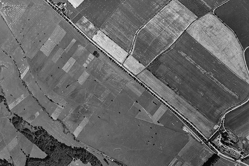 Území Sedmihorských mokřadů v r. 1958 na dobovém leteckém snímku. Vojenský geografický a hydrometeorologický úřad generála Josefa Churavého (VGHMÚř), Dobruška