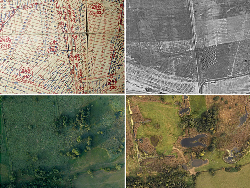 Revitalizovaná část Sedmihorských mokřadů. Situace z projektové dokumentace meliorací prováděných v letech 1965–67 (obr. a, červeně – meliorace podle původního plánu, modře – tehdejší zákresy skutečného provedení meliorací). Letecký snímek z r. 1966 (b). Snímek z dronu před revitalizací v r. 2019 (c), po revitalizaci v r. 2023 (d). Zdroje a foto: Archiv Povodí Labe, s. p. (obr. a), VGHMÚř, Dobruška (b), P. J. Juračka (c) a P. Stráníková, GREYCAT FILM, z. s. (d)