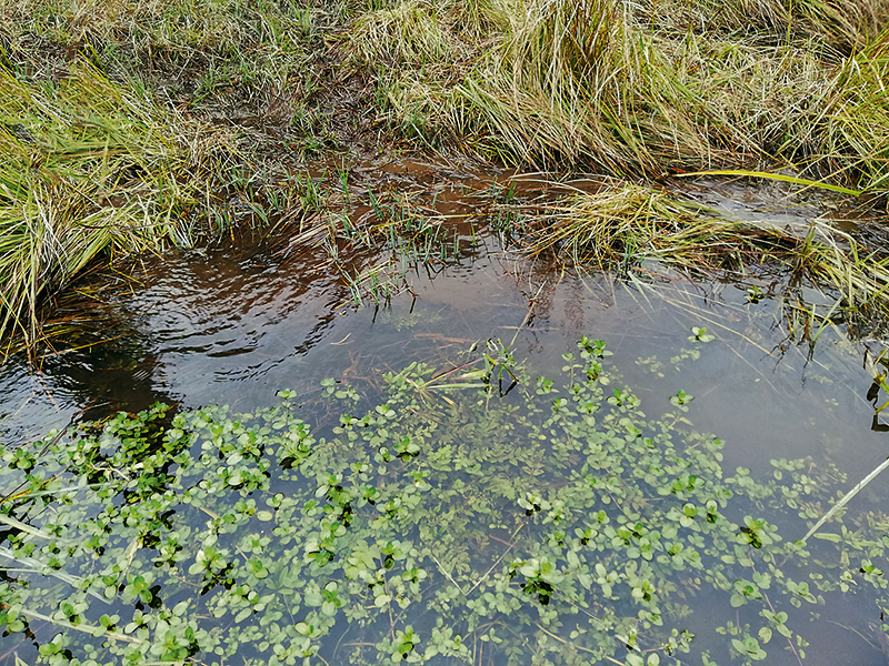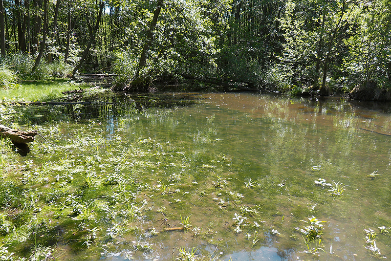 Přehled různorodého prostředí obývaného sekavcem podunajským v EVL Podtrosecká údolí. Přítoková část Krčáku s mocnými bahnitými sedimenty a mokřadní vegetací tvořenou převážně zblochanem (Glyce ria spp.) a hustým porostem okřehku (Lemna spp.). Foto M. Muška a P. Blabolil