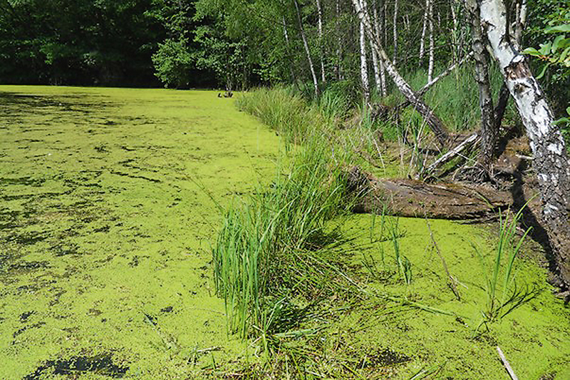 Přehled různorodého prostředí obývaného sekavcem podunajským v EVL Podtrosecká údolí. Přítoková část rybníka Věžák s rozsáhlými a hlubokými bahnitými nánosy a bohatým porostem zelených vláknitých řas – ideální stanoviště sekavce. Foto M. Muška a P. Blabolil