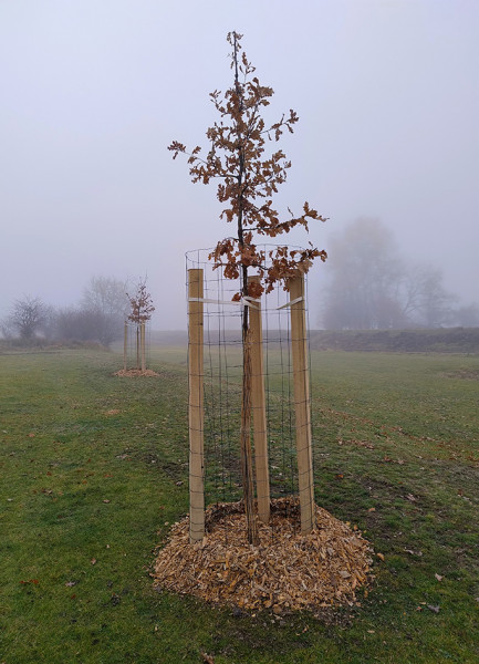 Ikonické staroduby na nivních loukách na Pohansku se postupně rozpadají, proto AOPK ČR finančně podporuje nové výsadby, které odumírající velikány v budoucnu nahradí. Výsadba u zámečku Lány v r. 2025. Foto Archiv AOPK ČR