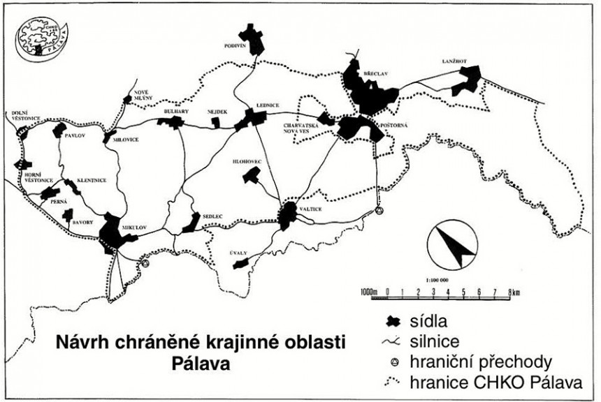 Návrh CHKO Pálava z r. 1992 o celkové výměře 17 500 ha zahrnující oblast Lednicko-valtického areálu a lužní lesy jižně od Lanžhota. Podle: J. Matuška (1993)