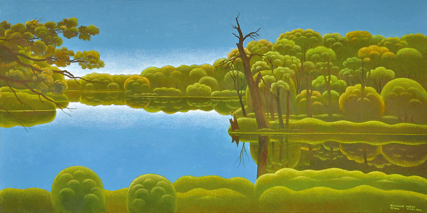 Území CHKO Soutok inspiruje mnoho výtvarníků. Břeclavské jezírko Bruxa. Olejomalba na plátně (100 × 200 cm, 2020). Orig. A. Vojtek