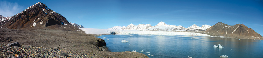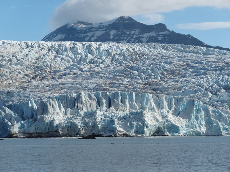 Okraj ledovce Nordenskiöldbreen v zátoce Adolfbukta na Západním Špicberku. Ledovce stékající k mořskému pobřeží jsou typickým rysem svalbardské krajiny, ačkoli ledové šelfy splývající na mořské hladině se rychle rozpadají. Foto M. Hanáček (2013)