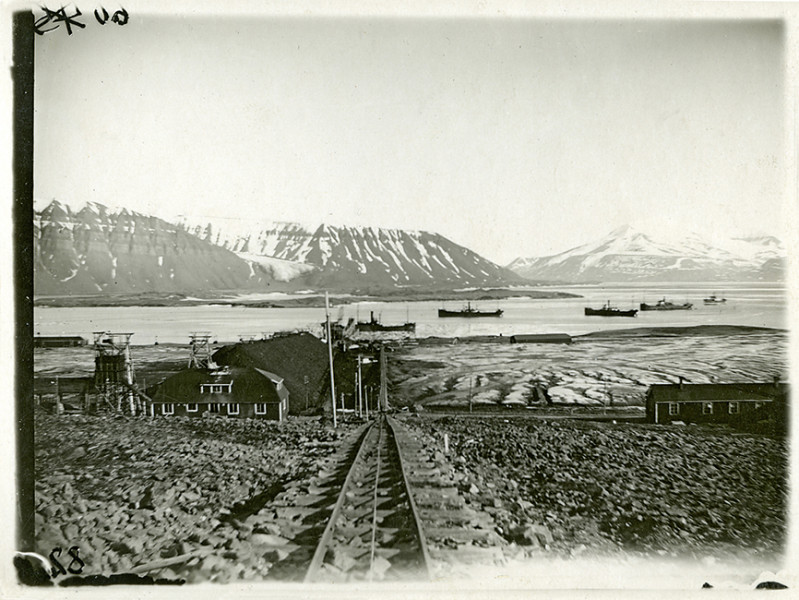 Hornická osada Sveagruva ve vnitřní části Van Mijenfjordu téměř uprostřed ostrova Západní Špicberk, 20. léta 20. století. Po kolejích bylo uhlí vyváženo z dolů na pobřeží a odtud pak nakládáno na lodě. Foto A. Eklöv. Svalbard museum, sbírka fotografií, s poděkováním za laskavé poskytnutí