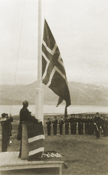 Longyearbyen, 14. srpna 1925. Slavnostní ceremoniál vyhlášení norské suverenity nad Svalbardem a začátek platnosti Svalbardské smlouvy. Na řečnickém pódiu stojí norský ministr spravedlnosti Paal Berg. Fotografie od neznámého autora. Svalbard museum, sbírka fotografií, s poděkováním za laskavé poskytnutí