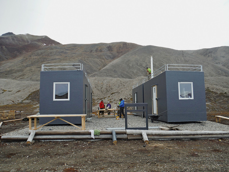 Stavba terénní základny Nostoc, součásti České arktické výzkumné stanice Josefa Svobody (více o něm v Živě 2019, 4: XCIV–XCVI), v zálivu Petuniabukta (srpen 2015). Foto P. Luláková