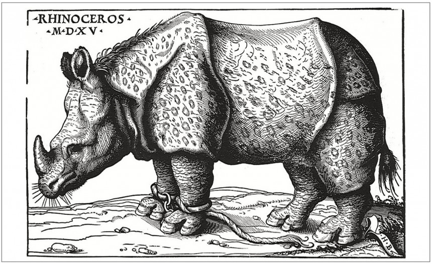 Dřevořez Hanse Burgkmaira Nosorožec, 1515 https://commons.wikimedia.org/wiki/File:Burgkmair.png