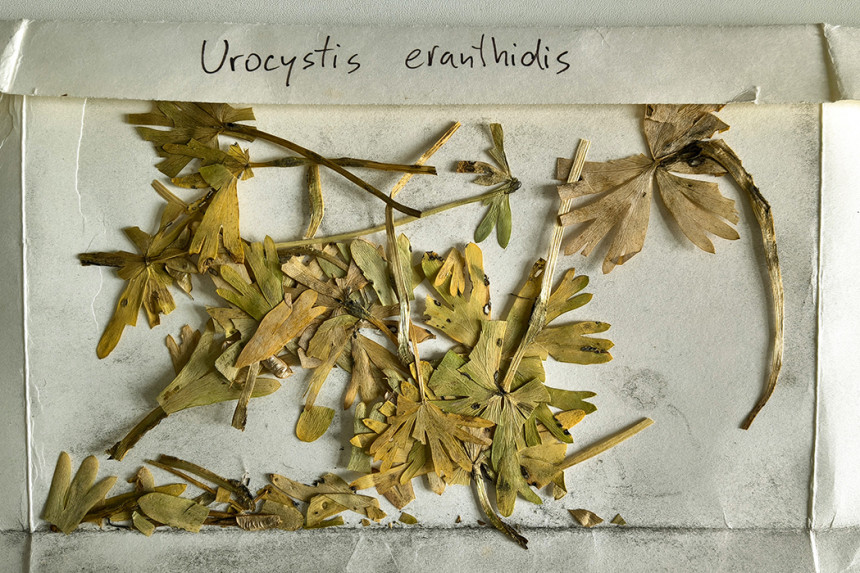 Sněť talovínová (Urocystis eranthidis) – sušená fungářová položka s lisovanými listy. Foto O. Koukol