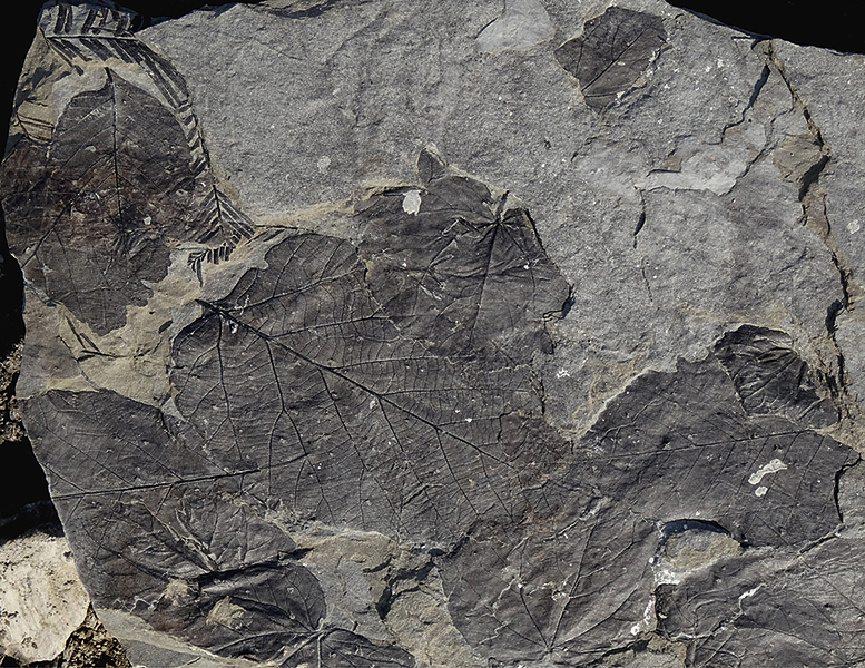 Pro polární listnatý opadavý les paleocénu a raného eocénu Arktidy byly charakteristické velké listy krytosemenných stromů. Listy bukovitého stromu rodu Ushia. Délka největšího listu 20 cm. Ostrov Západní Špicberk. Foto M. Hanáček