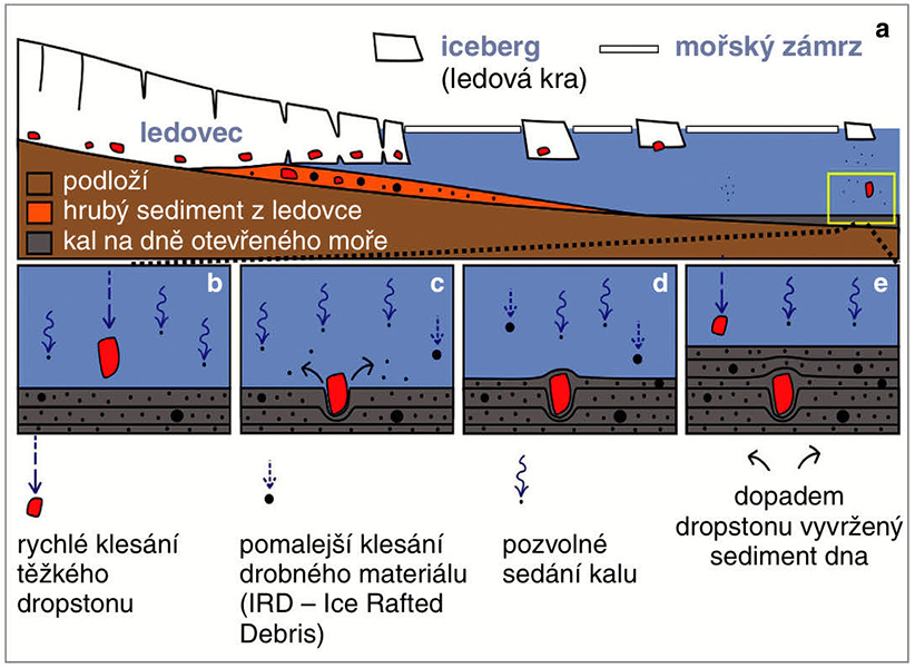 Schéma vzniku sedimentů s horninovými úlomky transportovanými ledem nebo plovoucími ledovci. Orig. M. Hanáček