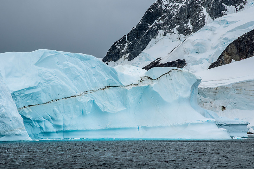 Iceberg – ledová kra oddělená od ledovce – s pruhem zamrzlých horninových úlomků u břehů Antarktického poloostrova. Foto M. Lulák