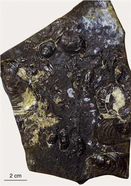 Mlž rodu Buchia, typický bentický taxon boreální oblasti přelomu jury a křídy. Vzorek z vrstev pozdní jury (149–143 milionů let), Západní Špicberk. Foto M. Hanáček
