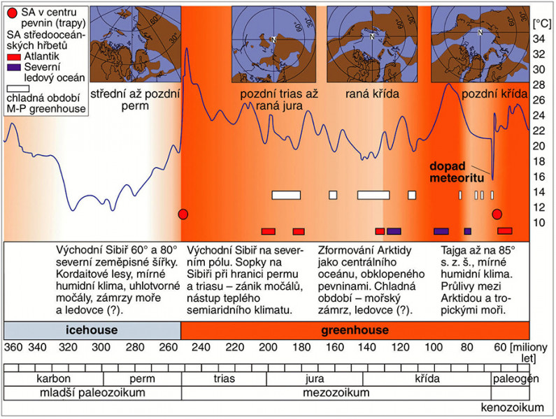 Průběh průměrné světové teploty a hlavní etapy vývoje Arktidy v mladším paleozoiku až eocénu. SA – sopečná aktivita, M-P – chladná období v rámci mezozoicko-paleogenního skleníkového klimatu. Zdroje dat: C. S. Scotese a kol. (2021, paleoteploty), J. Golonka a kol. (2003, paleogeografie) a A. L. Peace a kol. (2020, magmatismus Atlantského oceánu), K. L. Buchan a R. E. Ernst (2018, magmatismus Severního ledového oceánu)