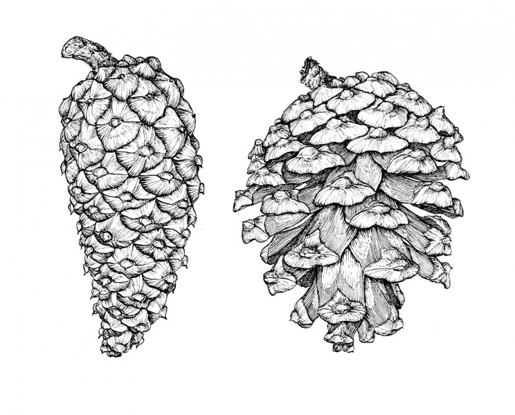 Kresba dvou šišek borovice Lawsonovy (Pinus lawsonii) popsané britským botanikem Georgem Gordonem pod jménem poprvé navrženým Roezlem. Zavřená šiška pochází z mexického státu Michoacán, otevřená ze státu Oaxaca. Orig. L. Businská