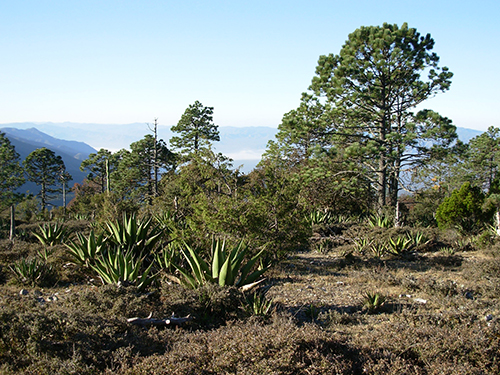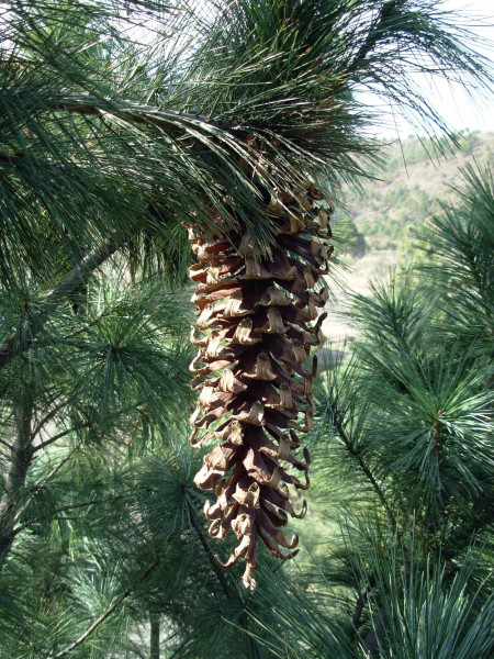 Větev v popředí a skupina stromů borovice mičoakánské (P. devoniana), druhu s nejdelšími jehlicemi plodných větví na světě, který byl Roezlem popsán pod čtyřmi platnými druhovými jmény. Pohoří okolo hranic mexických států Zacatecas a Jalisco. Foto R. Businský (únor 2007)