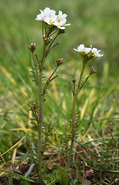 Řeřišnice Matthioliho (Cardamine matthioli). Oproti řeřišnici luční (C. pratensis) má tento druh čistě bílé květy a lístky lichozpeřených lodyžních listů postavené prakticky kolmo na vřeteno listu. Krče u Břeclavi. Foto J. Těšitel