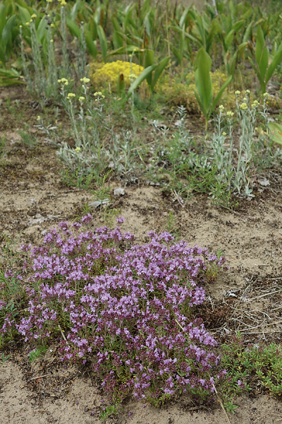 Víceleté druhy s rozsáhlým kořenovým/oddenkovým systémem rostou na písčitých dunách, např. mateřídouška úzkolistá (Thymus serpyllum, v popředí), smil písečný (Helichrysum arenarium) a z okrajů lesa vystupující konvalinka vonná (Convallaria majalis). Foto A. a T. Kučerovi
