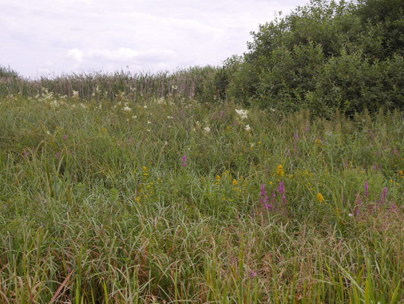 Méně druhů kvetoucích vysokých bylin najdeme v porostech nepůvodního puškvorce obecného (Acorus calamus). Foto A. a T. Kučerovi