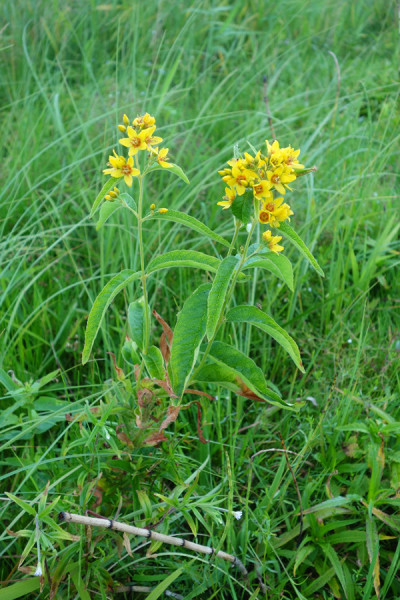 Tzv. pralouky jsou nivní vysoko-(stébelné+bylinné) porosty ladních luk, nesečené nebo jen výjimečně sečené, spíše v minulosti pasené velkými býložravci, tvořené převážně tzv. klonálními druhy, takže jen pomalu zarůstají náletem dřevin. Občasné zatopení a okus dřevin je zřejmě udržuje nezarůstající. Z běžnějších druhů v nich roste vrbina obecná (Lysimachia vulgaris, na snímku), kyprej vrbice (Lythrum salicaria) a sadec konopáč (Eupatorium cannabinum), tužebník jilmový (Filipendula ulmaria) a čistec bahenní (Stachys palustris). Foto A. a T. Kučerovi