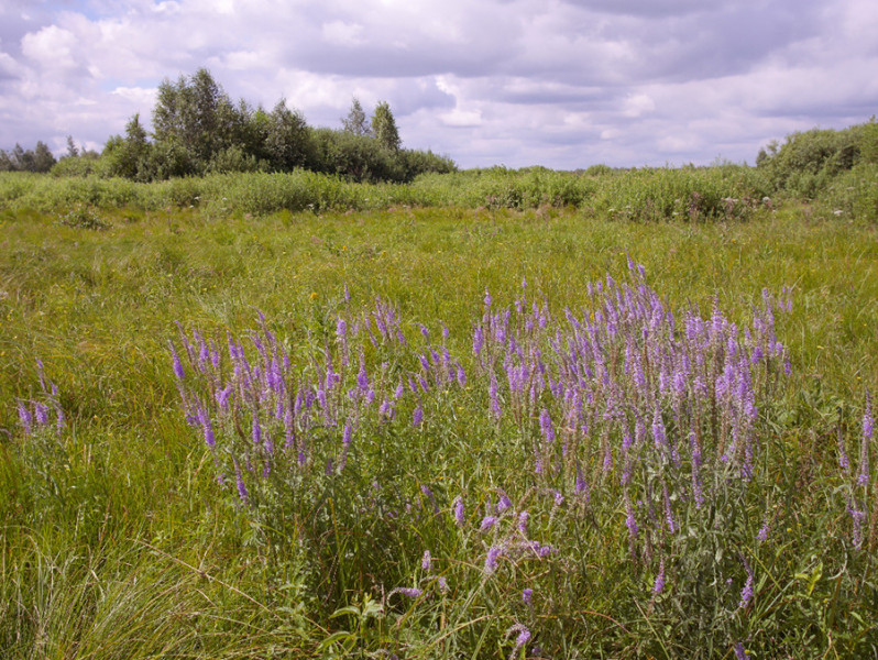 Zarůstající zaplavované nivní louky podél menších toků hostí dnes už vzácnou kombinaci vysokostébelných a vysokobylinných "praluk" s pestrobarevnou kombinací porostů purpurové kypreje vrbice (Lythrum salicaria, na snímku), modrofialového rozrazilu dlouholistého (Veronica maritima) a žlutého pryskyřníku velkého (Ranunculus lingua). Foto A. a T. Kučerovi