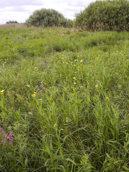 Zarůstající zaplavované nivní louky podél menších toků hostí dnes už vzácnou kombinaci vysokostébelných a vysokobylinných "praluk" s pestrobarevnou kombinací porostů purpurové kypreje vrbice (Lythrum salicaria), modrofialového rozrazilu dlouholistého (Veronica maritima) a žlutého pryskyřníku velkého (Ranunculus lingua). Foto A. a T. Kučerovi
