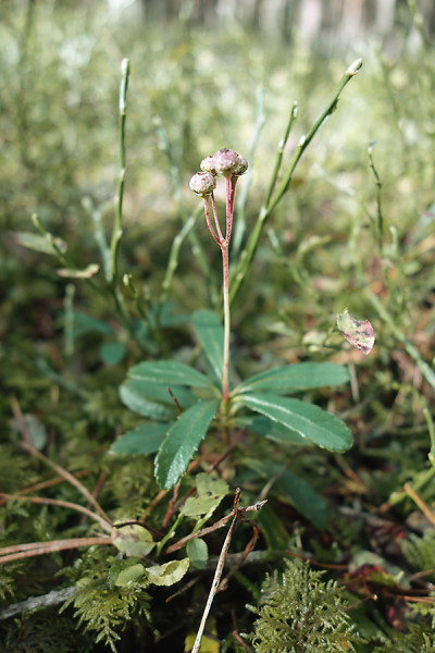 Vzácně se v borových lesích na dunách vyskytují zástupci hruštiček (nyní čeleď vřesovcovitých – Ericaceae), např. zimozelen okoličnatý (Chimaphila umbellata, na obr.) nebo běžnější hruštice jednostranná (Orthilia secunda). Foto A. a T. Kučerovi