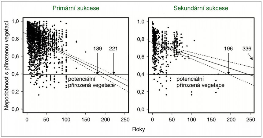 Extrapolace, která se snaží odhalit, kdy se primární a sekundární sukcese přiblíží přirozené vegetaci („klimaxu“). Horizontální linie u hodnoty 0,4 míry nepodobnosti ukazuje průměrnou nepodobnost mezi dvěma nejbližšími snímky přirozené vegetace a představuje tak jakousi referenční hodnotu. Upraveno podle: K. Prach a kol. (2016). Orig. K. Prach a M. Prach