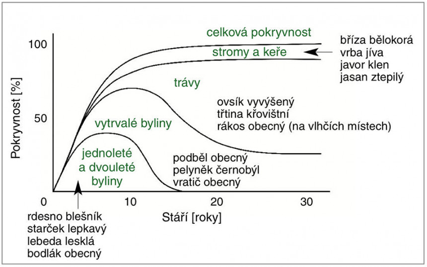 Směna životních forem při zarůstání výsypek na Mostecku. Uvedeny jsou nejčastější dominanty. Upraveno podle: K. Prach (1987)