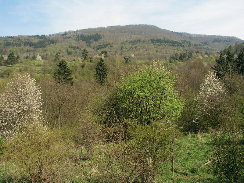 Zarůstající krajina Doupovských hor s mozaikou zhruba 60 let starých sukcesních stadií na opuštěných polích, loukách a pastvinách. Foto K. Prach