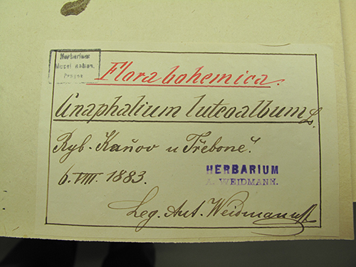 Položka protěže žlutobílé (Pseudognaphalium luteoalbum), kterou ke konci 19. století v rybníce Káňov na Třeboňsku sebral Antonín Weidmann, učitel a později ředitel na několika školách v jižních Čechách. Jeho pečlivě zpracované herbářové položky jsou dnes součástí velkých herbářových sbírek. Foto K. Šumberová