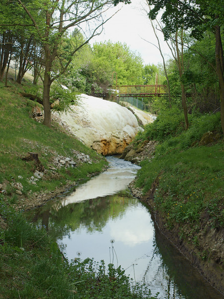 Santovka-vesnice. Uhličitan vápenatý, který se sráží kolem místních termálních pramenů, vytváří travertinové kupy. Tato konkrétní kupa postupně přehrazuje potok Búr a bez zásahu člověka by časem vytvořila v nivě přirozenou hráz a dala vzniknout jezeru. Tak vzniklo na lokalitě Santovka-PB, která je odsud vzdálená zhruba 2 km proti proudu potoka Búr, během pozdního glaciálu a holocénu jezero, které mělo přibližně 415 m na délku a 130–200 m na šířku. Foto A. Šolcová
